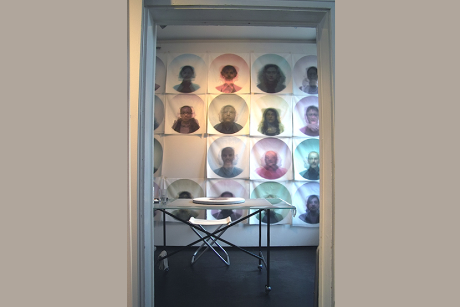 Ich portraitierte 24 Freunde und Bekannte nach einem selbst entwickelten Verfahren: Das oktaportrait vereint vier Ansichten eines Menschen in einem Bild, fotografiert aus den Perspektiven vorne, hinten, linkes und rechtes Profil. Halb transparentes Polyestergewebe doppelt das Motiv und erzeugt räumliche Tiefe, so entsteht der achtfache Charakter. Das monochrom getönte oktaportrait wirkt eher gemalt als fotografiert. (Fotografien Ursula Kreutz) 2009