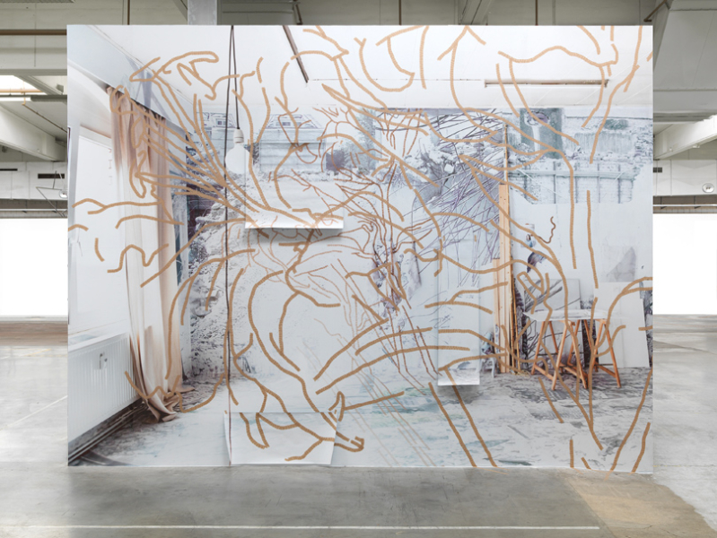 Auf AEG, Halle 20, Gemeinschaftsausstellung »best of…«, Nürnberg 2017, Klebebandzeichnung auf Papierfotodruck, 400 x 700